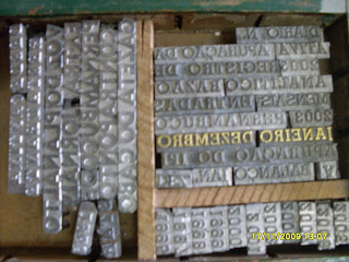 Seu acervo tipografico, contém fontes de familias tradicionais como a Times New Roman e Bodoni, além das famosas grotescas. Familias com corpos que variam de 9 a 24 pontos. Não deu para saber quantas caixas de tipos tem na oficina, pois seu Nilo, adaptou a organização das caixas a sua maneira. Separando as caixas por numerais, caixas altas e baixas e caracteres acentuados, acomodando em quatro caixas distintas (algumas familias tem mais caixas). A NFS - Encadernadora, possue cerca de 4 funcionários, e trabalha basicamente com encadernação e funciona na Rua Tupinambás, 570 - Santo Amaro, Recife - PE (próximo ao IML). Ele me forneceu uma informação importantíssima! Deu pistas de onde provavelmente se encontra a unica máquina da Linotype, em funcionamento em Pernambuco, e um possível contato do proprietário. Aguardem as novas descobertas da Expedição Tipográfica do Recife.
